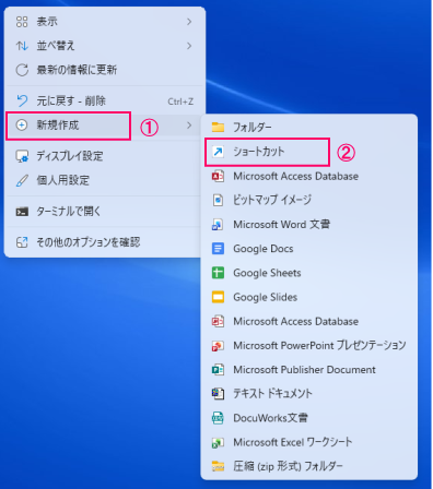デスクトップの空いているスペースを[右クリック]し、展開されたメニューの中から①[新規作成]をクリックしてください。