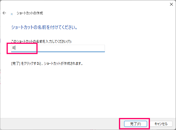 [次へ(N)]をクリックすると「ショートカットの名前を付けてください。」と書かれた画面に移動します。(ここでは簡単に「IE」と入力してます。ご自身がわかりやすい文字を入力して下さい。)